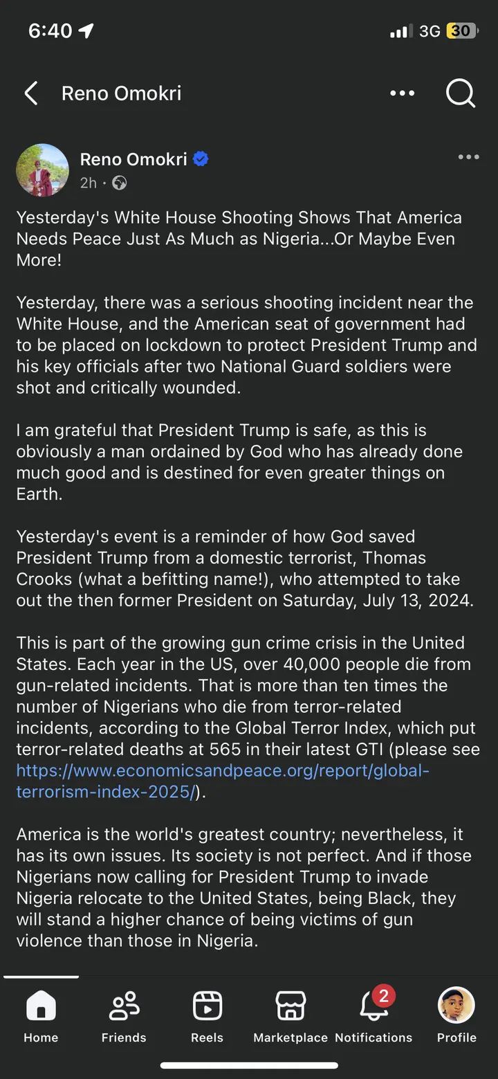 Renowned commentator Reno Omokri has sparked discussion about comparative safety between Nigeria and the United States following a recent shooting near the White House. Speaking on social media, Omokri questioned the perception that America is inherently safer than Nigeria, citing the recent gun violence incident that forced a lockdown around the seat of U.S. government.