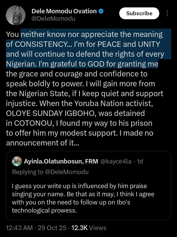 Responding to critics who questioned his motives following his earlier remarks on Nnamdi Kanu, the detained leader of the Indigenous People of Biafra (IPOB), he wrote, “You neither know nor appreciate the meaning of consistency… I’m for peace and unity and will continue to defend the rights of every Nigerian.”
