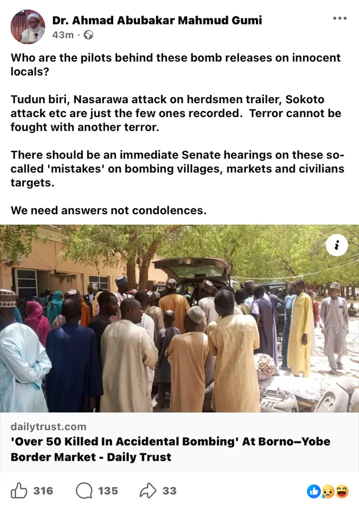 The post was accompanied by a photograph showing a crowd of people gathered around a vehicle, apparently at the scene of one of the incidents. It also included a link to a Daily Trust report titled “‘Over 50 Killed In Accidental Bombing’ At Borno–Yobe Border Market.” Read_More…