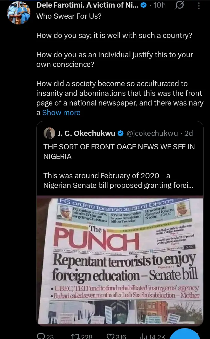 The post that triggered his reaction had been made by a social media user who wrote, “The sort of front page news we see in Nigeria. This was around February of 2020 — a Nigerian Senate bill proposed granting foreign education to ‘repentant terrorists.’ If something like this was presented to the legislative arm of the Nigerian government in 2020, imagine what must have been executed without going through the legislature in 2025.”