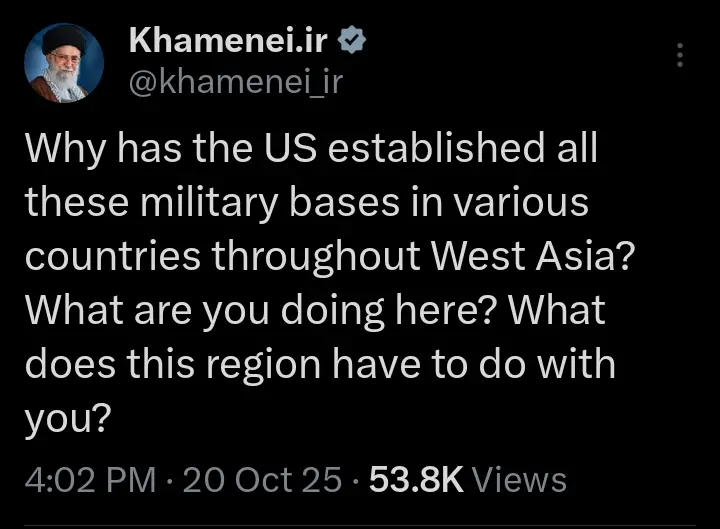 “Why has the US established all these military bases in various countries throughout West Asia? What are you doing here? What does this region have to do with you?” Khamenei wrote in a pointed message questioning Washington’s strategic presence across multiple Middle Eastern nations.