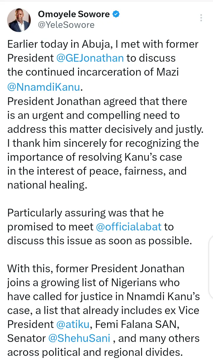 “Earlier today in Abuja, I met with former President, Goodluck Ebele Jonathan to discuss the continued incarceration of Mazi Nnamdi Kanu. President Jonathan agreed that there is an urgent and compelling need to address this matter decisively and justly. I thank him sincerely for recognizing the importance of resolving Kanu’s case”.