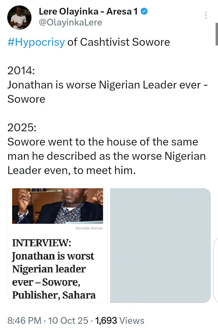 Lere Olayinka, the Senior Special Assistant on Public Communication and Social Media to the former governor of Rivers state, Nyesom Wike has reacted after seeing Omoyele Sowore and former President, Goodluck Ebele Jonathan together.