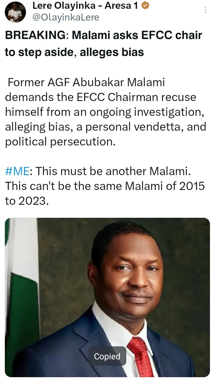 In his post, Olayinka expressed disbelief at Malami’s stance, implying that the former justice minister’s current complaints were inconsistent with his past conduct in office. He questioned whether this was the same Malami who held power from 2015 to 2023, suggesting a dramatic shift in narrative.