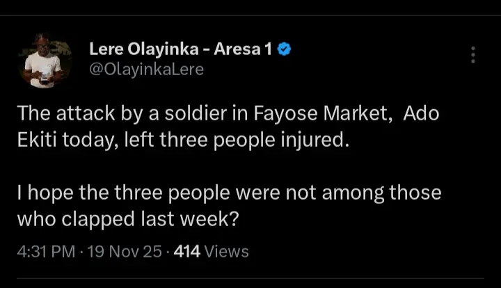 Lere Olayinka, the senior special adviser on media to the former governor of Rivers State and FCT minister, Nyesom Wike has taken to his official X handle to react after a soldier whose identities were withheld was involved in an altercation at the popular Fayose Market in Ekiti State. According to the statements which were shared on his official X handle, he pointed out that the military officer injured three persons.