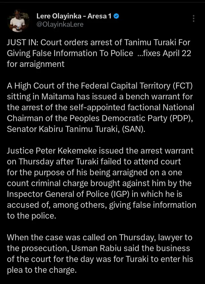 Lere Olayinka, the senior special adviser on media to the FCT minister and former governor of Rivers State, Nyesom Wike recently reacted after a federal high court in Abuja ordered the arrest of PDP national chairman, Tanimu Turaki. According to the statements which were shared on his official X handle, he pointed out that the chairman gave false information to the police.
