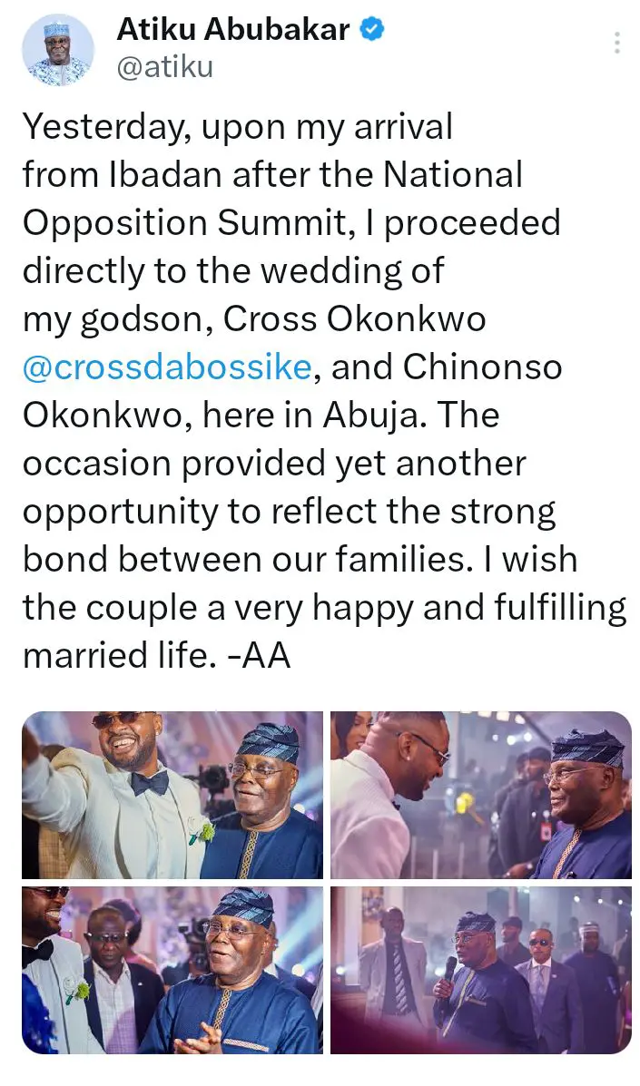 In recent post on his official X page, former Vice President Atiku Abubakar reacts to his attendance at a family wedding shortly after returning from Ibadan, where he participated in the National Opposition Summit. He revealed that despite a demanding political schedule, he made it a priority to honor a personal commitment by attending the wedding of his godson, Cross Okonkwo, and his bride, Chinonso Okonkwo, in Abuja.