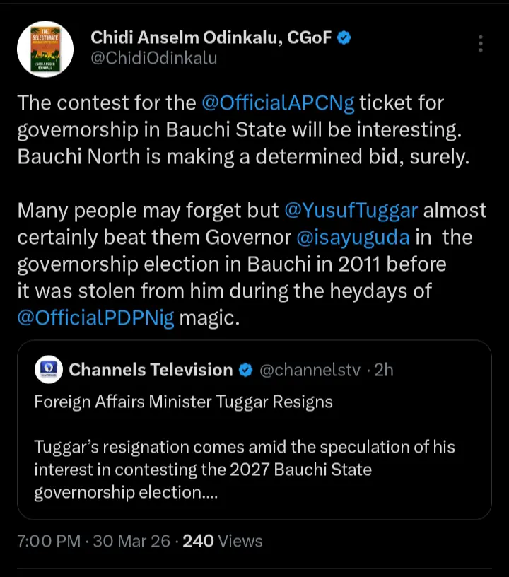 Chidi Odinkalu, a renowned human rights activist and legal practitioner has taken to his official X handle to react after the minister for foreign affairs, Yusuf Tuggar announced his interest to contest the 2027 gubernatorial elections in Bauchi State. According to the statements which were shared on his official X handle, he disclosed how the minister’s mandate was stolen from him in 2011.